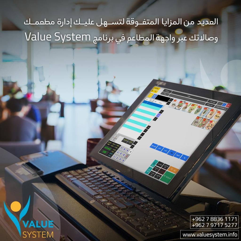 تم تصميم نظام نقاط المبيع و المطاعم في برنامج فاليو ليسهل العمل على المستخدم فهو يتمتع بواجهات بسيطة وعمليّة تمتاز بتصميم إحترافي ودقّة في العرض، تضم كل ما يحتاجه المستخدم من أزرار أوامر (بيع-مرتجع-زبون-حسومات.. الخ)، مع إمكانية تغيير واجهة العمل حسب المطلوب، بالإضافة إلى ارتباطه مع نظام المحاسبة و المستودعات وإمكانية استعراض وقراءة التقارير المحاسبية و المستودعية بكل سهولة و دقة ، بالإضافة إلى وجود خيارات خاصة لإدارة وتعريف الأقسام و الصالات وضبط خصائصها بما يتناسب مع طبيعة العمل